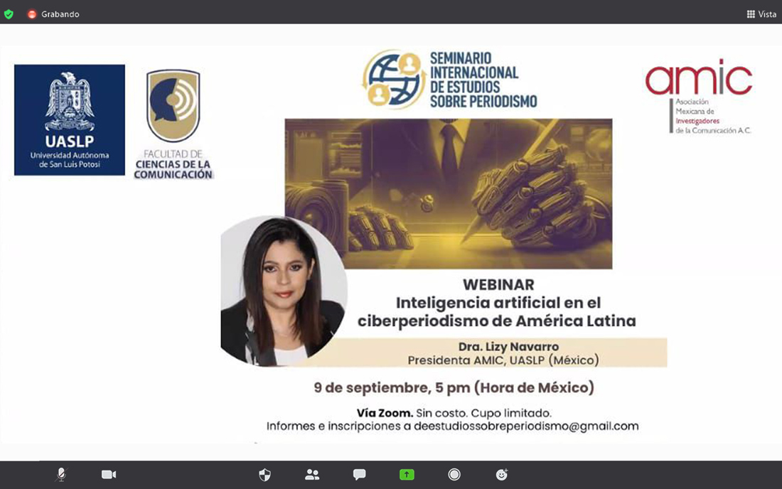 Hace unos días, la Dra. Lizy Navarro Zamora, presidenta de la Asociación Mexicana de Investigadores de la Comunicación (AMIC), ofreció una webinar titulada: “Inteligencia Artificial en el ciberperiodismo de América Latina”, como parte del Seminario Internacional de Estudios Sobre Periodismo, auspiciado por la Facultad de Letras y Comunicación de la Universidad de Colima, en colaboración con otras universidades nacionales y extranjeras.