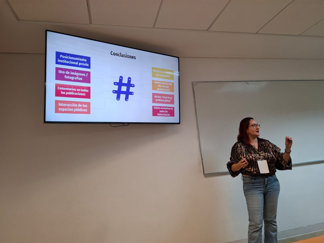 En cuanto a la Dra. Alma Celia Galindo Núñez, presentó su investigación: “Narrativas universitarias en Instagram sobre el #8M, en tendederos digitales”. En su ponencia, analizó cómo los colectivos feministas en universidades mexicanas utilizan redes sociales para visibilizar la violencia de género. Destacó que un 80% de las publicaciones estudiadas corresponden a denuncias de violencia ejercida por estudiantes.