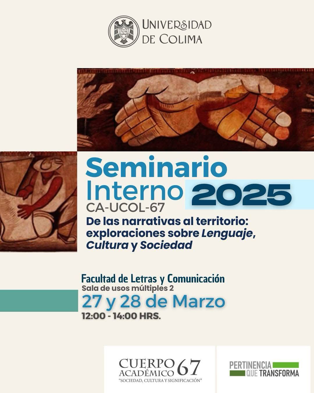 Con el propósito de fortalecer el trabajo académico colaborativo y fomentar la participación colegiada en proyectos de investigación y divulgación, el Cuerpo Académico 67 (CA67) “Sociedad, cultura y significación” de la Universidad de Colima (UdeC), realizó su Seminario Interno 2025 bajo el título “De las narrativas al territorio: exploraciones sobre lenguaje, cultura y sociedad”, en la Facultad de Letras y Comunicación.