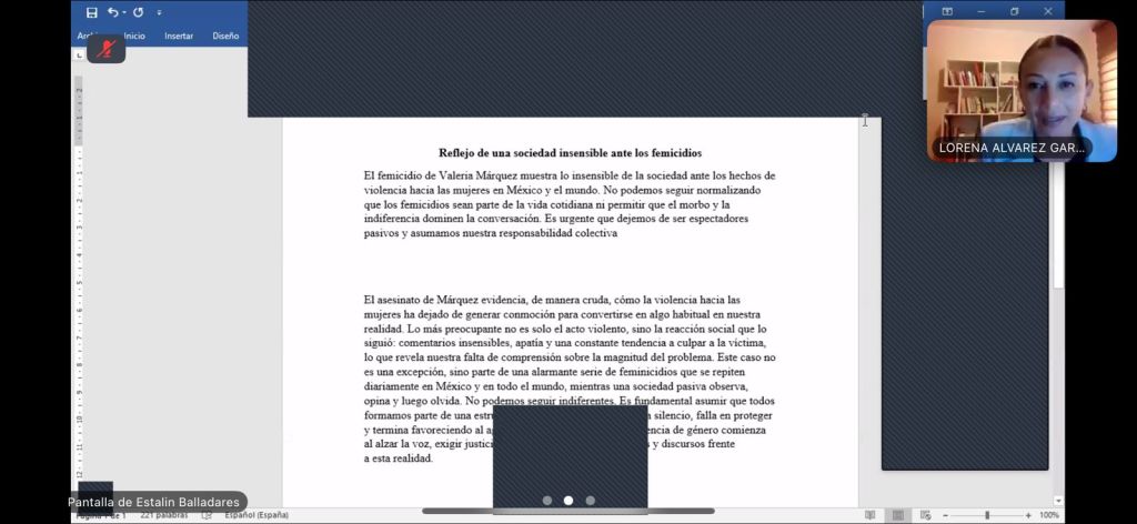 El día viernes 16 de mayo, la doctora Lorena Catherine Álvarez Garzón, docente de la asignatura Géneros de opinión y líneas editoriales en la carrera de Comunicación de la Universidad Técnica de Cotopaxi, de Ecuador, impartió una sesión en el marco de la clase espejo con la Facultad de Letras y Comunicación.