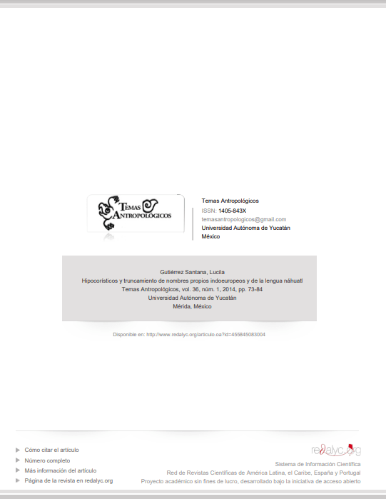 Gutiérrez Santana, L., (2013). Hipocorísticos y truncamiento de nombres propios indoeuropeos y de la lengua náhuatl. Temas Antropologicos. Revista Científica de Investigaciones Regionales , 36 (1), 73-84.