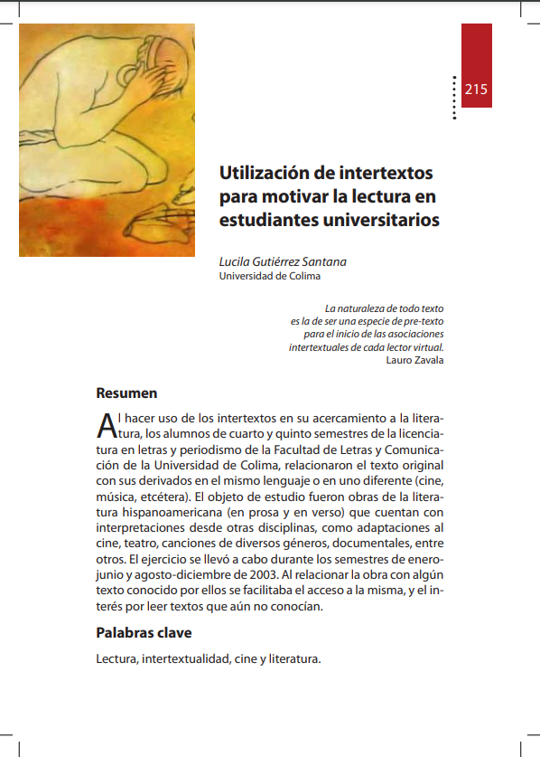 Gutiérrez, L. (2013) Utilización de intertextos para motivar la lectura en estudiantes universitarios. Interpretextos. Vol. 11. N° -. Pp. 215-226.